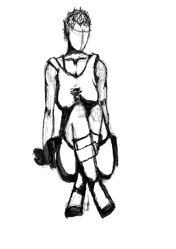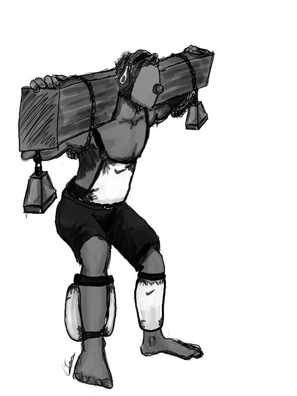 This is my Harrison Bergeron concept completed for one of my University projects. I really enjoyed the story and idea that to create an equal country the government decides to impede the gift to bring them down to an equal level ability. When designing him I came up with the idea that companies which in the present make their money, by supplying equipment to help people improve, would change their morals/company and make stuff which impeded, instead of improving peoples abilities. This is why I've added logos to the weights.