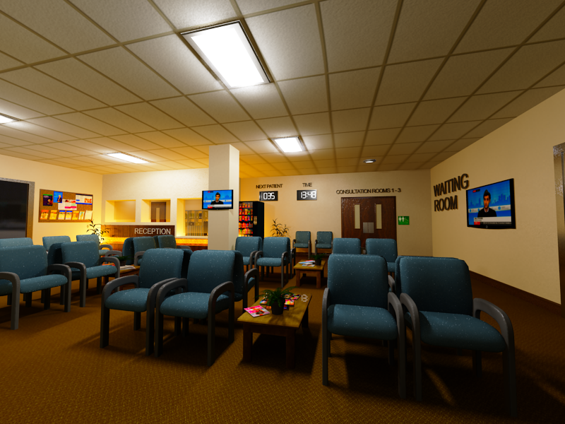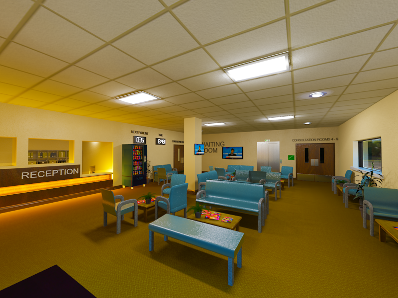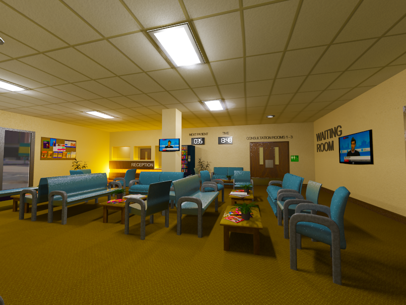 This was a freelance job where i was hired to create a 3D waiting room for a University of Warwick PHD Student. My role on this project was to create a basic model of a hospital waiting which then could be populated with various objects which could be changed or arranged differently so that the the client could test to see peoples reactions of feelings towards each waiting room variation.